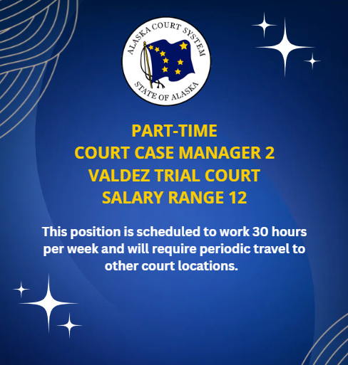 As a courtroom judicial assistant, the employee supports judicial officers during hearings in the Valdez, Glennallen, and Cordova courts.