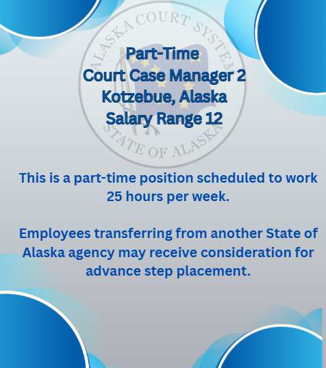If you are the selected applicant, you will become a part of the Kotzebue Trial Court helping to fulfill the mission of the Alaska Court System!