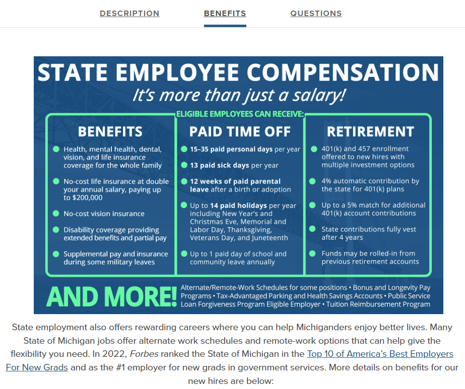 https://www.michigan.gov/mdcs/-/media/Project/Websites/mdcs/JOBSPECS/D/DepartmentalAnalyst.pdfThe State of Michigan has been recognized as a leading U.S. employer by new graduates from 2021-2023 and a best large U.S. and state employer. Recognized on the international stage for fostering positive employee engagement, the State of Michigan is a past recipient of a North America Government Agency Employees Engagement Award.