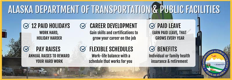 The benefits of joining our team:Joining the Alaska Department of Transportation & Public Facilities (DOT&PF) offers an array of benefits, with career growth opportunities at the forefront.