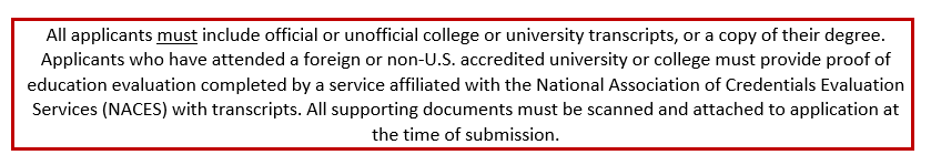 A COMPLETED SUPPLEMENTAL QUESTIONNAIRE IS REQUIRED. ALL APPLICANTS MUST SUBMIT A COPY OF THEIR REGISTERED NURSE LICENSE AND BASIC LIFE SUPPORT CERTIFICATIONS AT TIME OF APPLICATION AND INCLUDE THEIR REGISTERED NURSE LICENSE NUMBER IN THE 'CERTIFICATES AND LICENSES' SECTION OF THE APPLICATION.