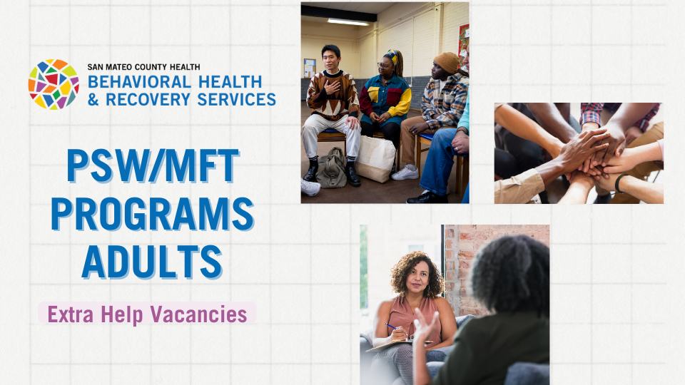 San Mateo County Health's Behavioral Health and Recovery Services (BHRS) and Correctional Health Services (CHS) are currently hiring Extra Help Psychiatric Social Worker/Marriage & Family Therapist I/II in a range of specialty programs!