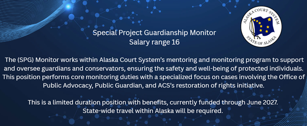 This role involves monitoring guardianship and conservatorship cases in Alaska's court system by reviewing files, interviewing family members and service providers, and ensuring guardians follow court rules to protect vulnerable people.